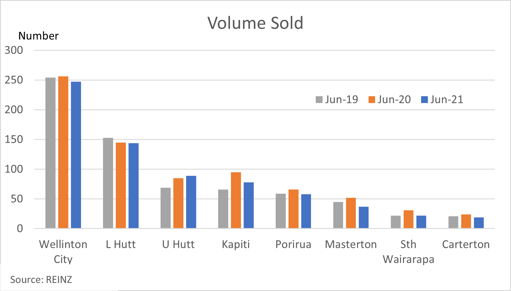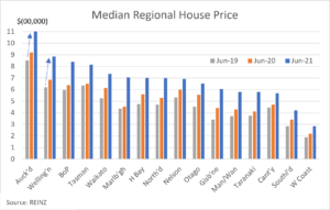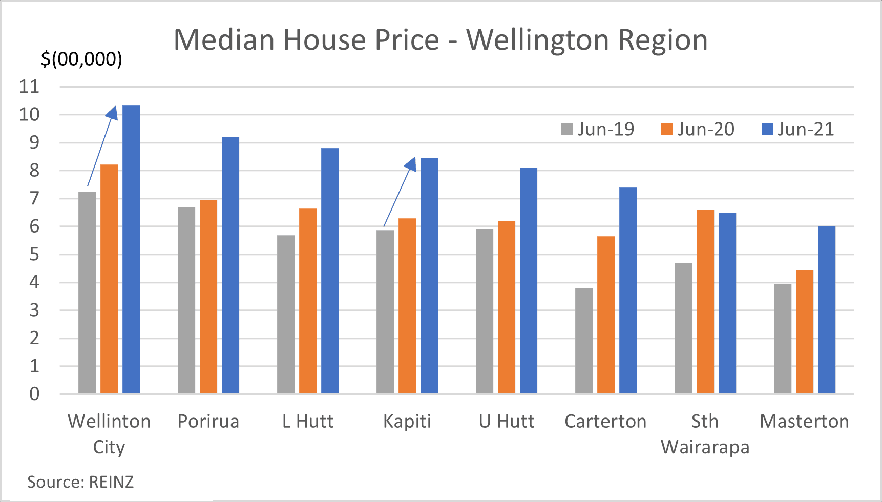 - In Kapiti, there are signs that house price growth may be on the turn after peaking at an in-sane 39.0% in May. The median price in Kapiti has eased after peaking above $900,000 in April, recording a median price of $845,000 in June down from $895,000 in May. Annual house price growth edged lower to 34.1% in June
